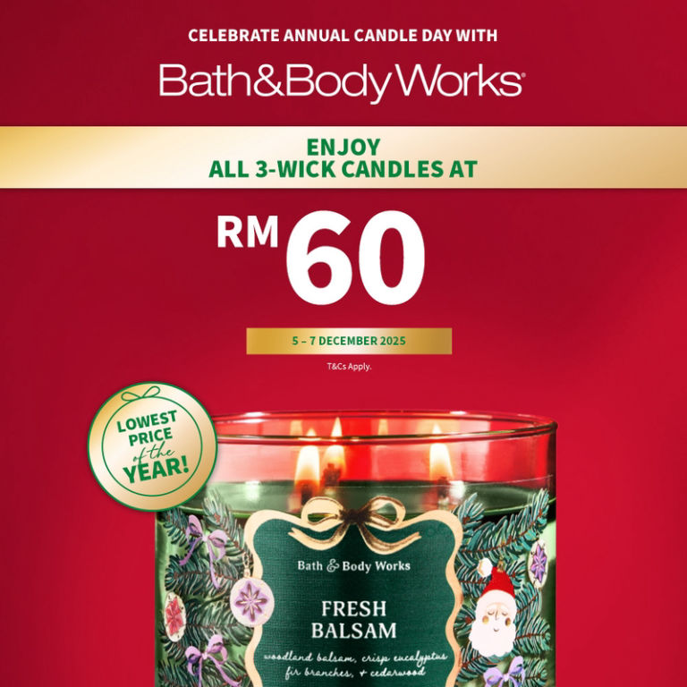 Celebrate the opening with Bath & Body Works. Enjoy all 3-wick candles at RM60 from now 5 till 7 Dec 2025 only!