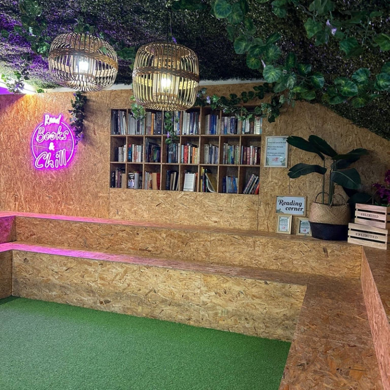 Shelf of books for sharing; swap books or donate at our Edutainment Hub. Together let's spread the joy of reading.