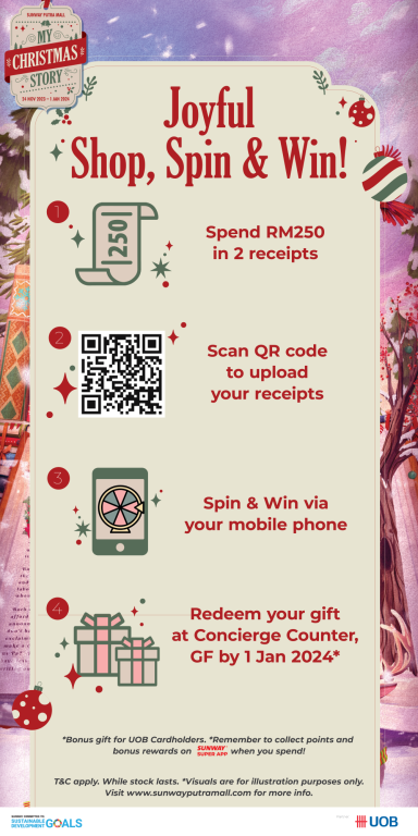 Shop more this Christmas and redeem exclusive Christmas gifts worth up to RM80,000! Win a Samsung Galaxy Z Flip5, AirPods Pro (2nd generation), Swarovski Infinity Bracelet, Sunway Putra Hotel 2D1N stay, cash vouchers and so much more!